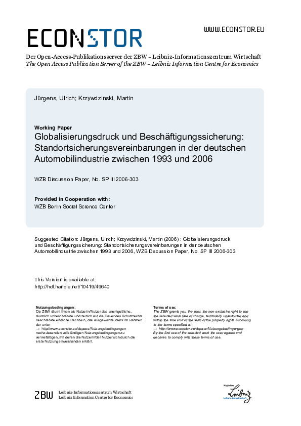 Pdf Globalisierungsdruck Und Beschaftigungssicherung Standortsicherungsvereinbarungen In Der Deutschen Automobilindustrie Zwischen 1993 Und 2006 Martin Krzywdzinski And Ulrich Juergens Academia Edu